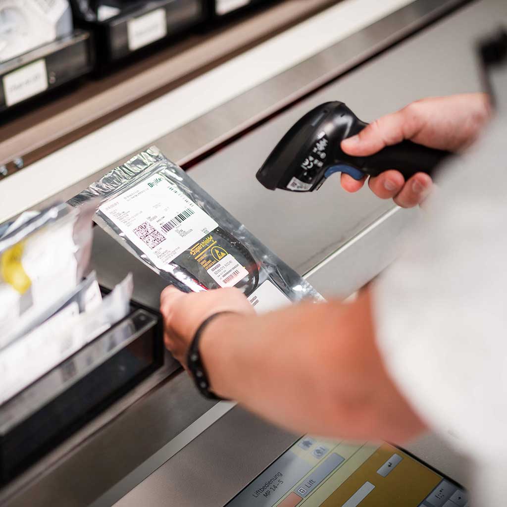 Unser Nordson Rötgenbauteilzähler kann mittels Rötgenstrahlung schnell und zuverlässig erkennen, wieviele Artikel noch auf einem Gebinde sind. Die Zählung eines typischen SMD-Gebindes dauert so nur wenige Sekunden. Der Bestand wird direkt im MES angepasst, um für weitere Planungen jederzeit einen genauen Lagerbestand zu haben. Zusätzlich gibt es ein neues Etikett für das Gebinde.